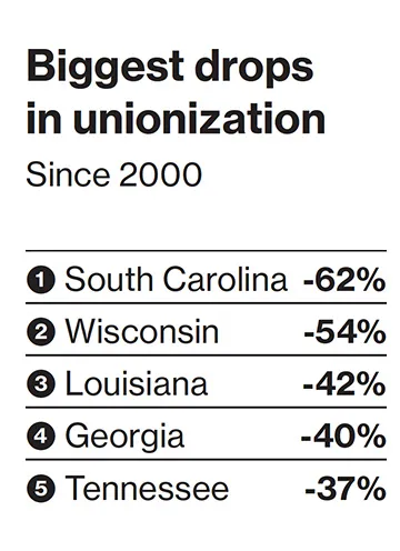 底线: 劳动权利法正在侵蚀工会在北方和中西部的长期据点。