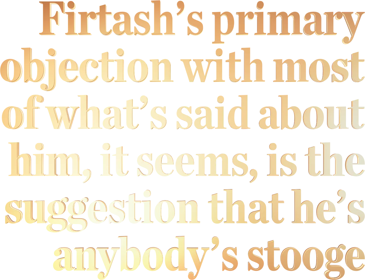 Firtash对大多数关于他的言论的主要反对似乎是暗示他是任何人的傀儡。他说,他是通过努力工作和良好的时机变得富有的。他最喜欢的童年故事,他讲过很多次,是关于他的家人如何种西红柿并在他们的村庄里出售,以补充在苏联统治下微薄的收入。“今天这可以称为创业灵活性,”他说。他省略了一些不太光彩的职业亮点,比如1995年他因走私违禁酒精 reportedly 被监禁三个月的那次。