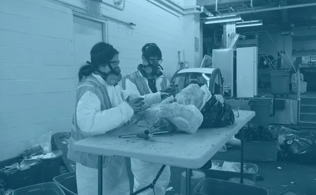 成群的行人走过外面,穿着冬靴,手里拿着迅速变凉的咖啡。1月的下午寒冷刺骨,贝琳达·李拉下她的呼吸器说这是一个受欢迎的变化。几个月前,当李和她的垃圾侦探团队在纳什维尔翻找垃圾时,天气要温暖得多。“有些东西真的很臭,”她说。几个袋子在阳光下煮过,里面爬满了蛆虫。Tyvek防护服、钢头靴、安全护目镜、手套和呼吸器保护团队免受近距离接触的影响。但他们已经在厨房垃圾中浸泡了几个月。
