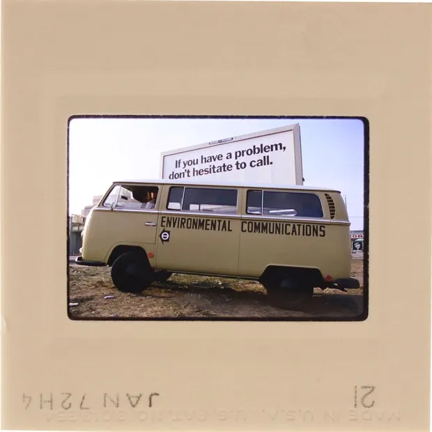 一辆有计划的面包车。环境传播/LAXART也许是受1970年代校园变革精神的影响,大学实际上购买了这些幻灯片,将EC的激进去中心化的透明图像混入他们的传统收藏中。想象一下,幻灯片一:一排维多利亚风格的房屋,端庄地坐落在邦克山上。*点击。*幻灯片二:两个穿着比基尼的骑自行车者在威尼斯海滩的一家干洗店外,在明亮的下午阳光下。 *点击。*幻灯片三:市中心的多萝西·钱德勒音乐厅,展现其严肃的优雅。*点击。*幻灯片四:在红色街灯照耀的步道上,一名年轻人张开双臂面对一名警察。