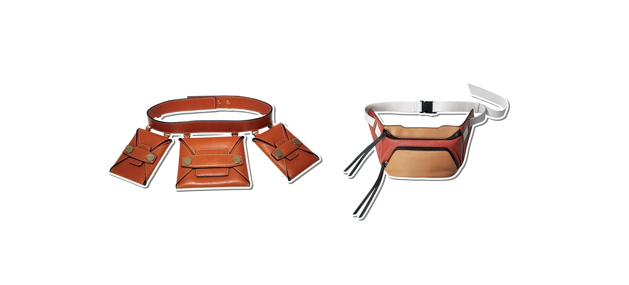 (从左侧) 多功能腰带: 非常适合存放信用卡、钥匙和其他小物件,适合外出时使用。采用环保的素皮革。Stella McCartney Alter Nappa 腰包,$1,210;Stella McCartney NY, 112 Greene St., New York。腰包: 由多色棕色皮革制成,这款绝对不是为游客设计的。DKNY 皮革腰包,$398;精选 DKNY 专卖店。摄影师:Eric T. White 为彭博商业周刊