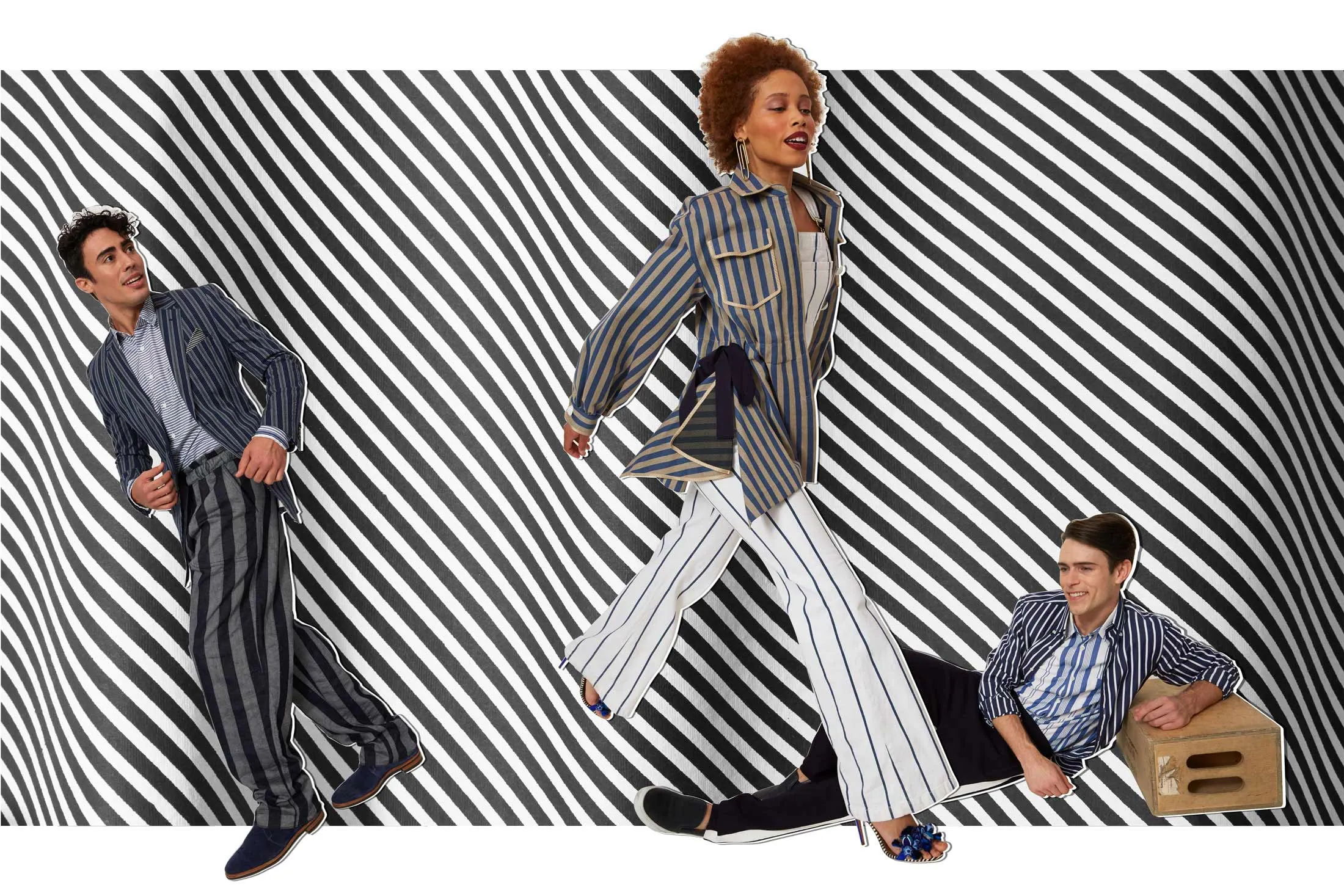 (从左) **这些裤子有额外的蓬松感,但竖条纹让它看起来更平衡:**Todd Snyder 外套,价格面议;Todd Snyder,25 E. 26th St.,纽约。Andrea Pompilio 衬衫,$229.09,裤子,$516.79;Bloomingdale’s,1000 Third Ave.,纽约。Armani Collezioni 口袋巾,$95;类似款式可在 saksfifthavenue.com找到。John Lobb 靴子,$1,435;johnlobb.com。**配套的单品给你带来极大的灵活性。可以一起穿出流线型的外观,或单独搭配你最喜欢的单品:**Fendi 外套,$2,000;Fendi,598 Madison Ave.,纽约。Frame 上衣和裤子,$339;neimanmarcus.com。Jennifer Fisher 耳环,$445;jenniferfisherjewelry.com。Aquazzura 凉鞋,$850;aquazzura.com。 Tommy Hilfiger 衬衫,$89.50;Tommy Hilfiger,681 Fifth Ave.,纽约。A.P.C. 衬衫,$180;apc.fr。Vince 裤子,$395;Vince,980 Madison Ave.,Space A,纽约。Aquatalia 鞋,$395;aquatalia.com。摄影师:Eric T. White 为彭博商业周刊### 前卫条纹