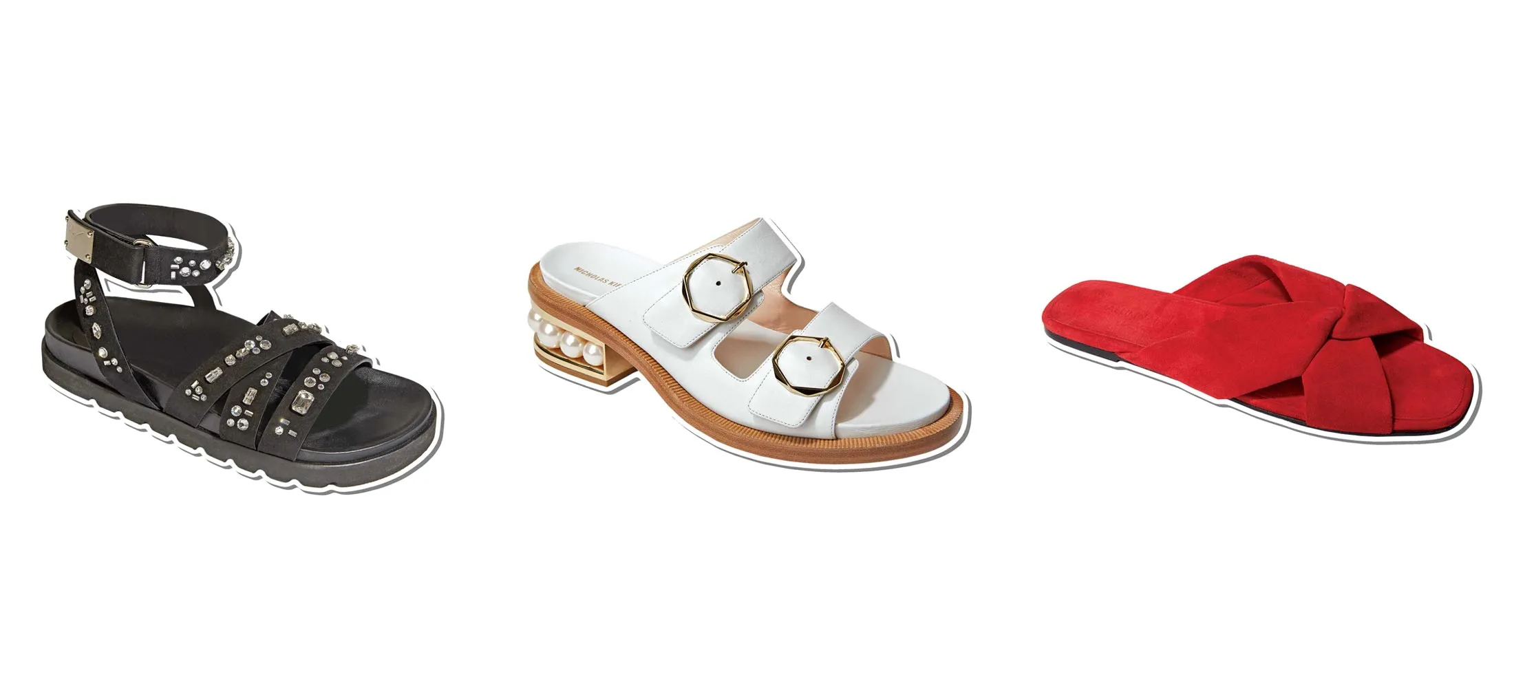 (从左) 厚底鞋: 水晶铆钉和精致的脚踝绑带为这些Teva风格的美鞋增添了一丝优雅。Giuseppe Zanotti黑色水晶装饰的带跟平底凉鞋,$950; giuseppezanottidesign.com。高跟鞋: 保持低跟和堆叠,便于穿着。这双鞋上的珍珠增添了亮点。Nicholas Kirkwood Casati珍珠双带凉鞋,$895; nicholaskirkwood.com。滑鞋: 今年最大的女性鞋子趋势,采用柔软的打结绒面革。Alumnae Soft X-Slide凉鞋,$425; alumnae.nyc。摄影师:Eric T. White 为彭博商业周刊
