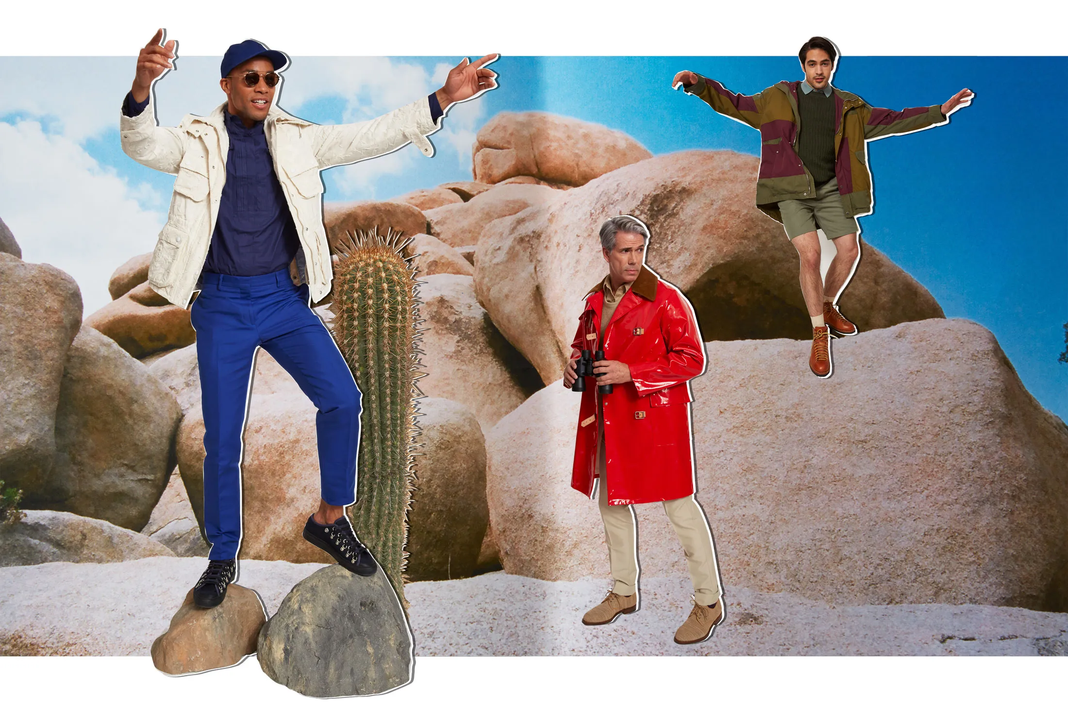 (从左) Maison Kitsuné 外套,$1,100;kitsune.fr。Salvatore Ferragamo 衬衫,$790,裤子,$690;saksfifthavenue.com。A.P.C. 帽子,$125;apc.fr。Barton Perreira 眼镜,$560,夹式太阳镜,$130;bartonperreira.com。J.W.Anderson 运动鞋,$525;j-w-anderson.com。Gucci 外套,$2,780;gucci.com。Saturdays NYC 毛衣,$165;saturdaysnyc.com。J.Crew 衬衫,$118;jcrew.com。Ring Jacket 裤子,$375;thearmoury.com。Aquatalia 鞋子,$695;aquatalia.com。 如果你不能穿短裤,修身的 chinos 也可以: Bally 外套,$1,995;Bally,628 Madison Ave.,纽约。3.1 Phillip Lim 毛衣,$375;31philliplim.com。Orley 衬衫,$445;orley.us。A.P.C. 短裤,$220;apc.fr。Pantherella 袜子,$28;shop.nordstrom.com。Feit 鞋子,$700;feitdirect.com。摄影师:Eric T. White 为彭博商业周刊### 户外冒险