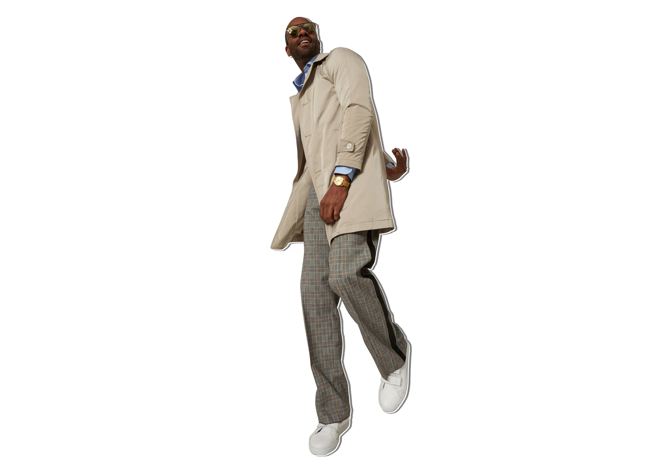 千鸟格裤子意外地增加了侧条纹,向你最喜欢的运动裤致敬: Ring Jacket 外套,$1,025;ringjacket.com。Hamilton 衬衫,$215;hamiltonshirts.com。Maison Margiela 裤子,价格面议;Maison Margiela 专卖店。Mykita 太阳镜,$519;mykita.com。Larsson & Jennings 手表,$475;larssonandjennings.com。Jeffrey Rüdes 运动鞋,$650;jeffreyrudes.com。摄影师:Eric T. White 为彭博商业周刊