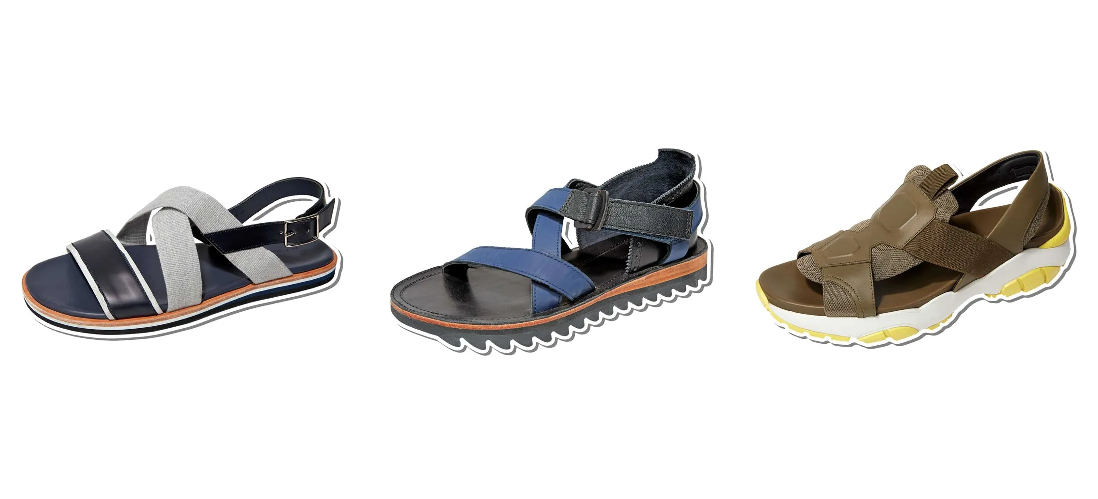 (从左) 后跟鞋: 丝带和图形白色装饰将带你从夏季周五直接到夏季烧烤。Want Les Essentiels Jobim凉鞋,$295; wantlesessentiels.com。魔术贴鞋: 更多Teva风格的鞋子,这次采用精细的刷皮革,后跟有细微的打孔。Sacai皮革凉鞋,$1,250; sacai.jp。 运动鞋: 不要被模压泡沫鞋底和宽松弹性带等技术细节所吓倒。它们提供比传统风格更多的稳定性和脚部覆盖。Salvatore Ferragamo懒人鞋,$920;类似款式可在 ferragamo.com。