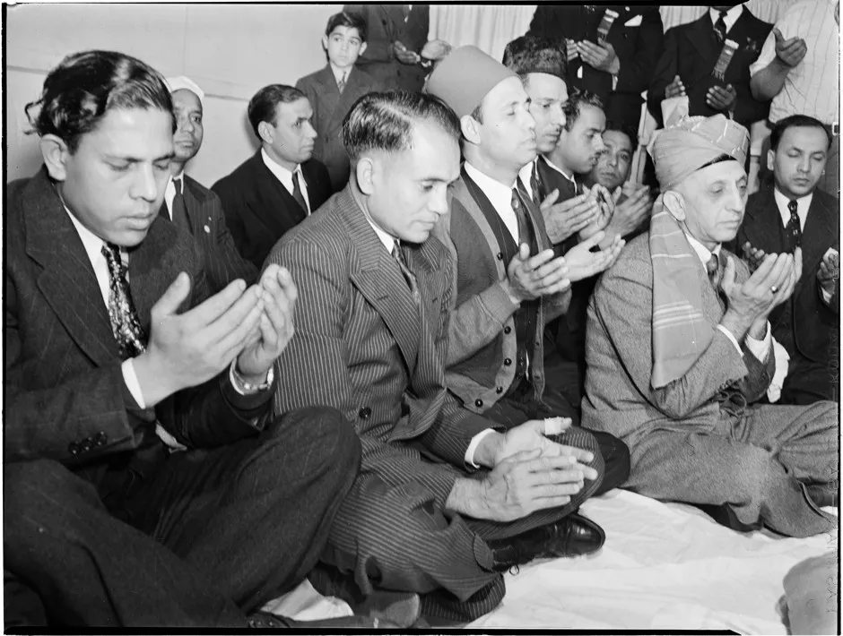 1940年,穆斯林身穿西装在聚会上祈祷。亚历山大·阿兰德/纽约市博物馆提供