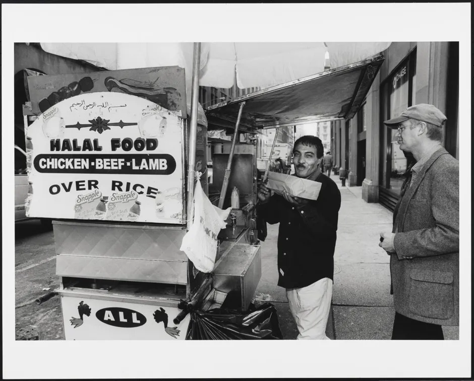 2001年,一名清真食品摊贩对着镜头微笑,客户在等待他的订单。梅尔·罗森塔尔/纽约市博物馆提供