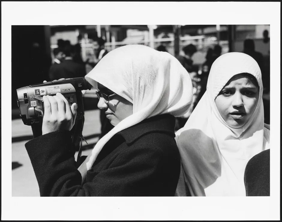 1999年,两名戴头巾的女学生玩摄像机。梅尔·罗森塔尔/纽约市博物馆提供