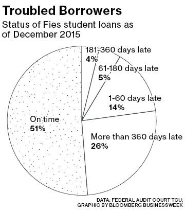 与此同时,对于在营利性大学接受的教育质量知之甚少。没有关于就业率或毕业生薪资的数据。审计法院收集的贷款违约率描绘了一幅严峻的图景。2015年12月,49%的Fies学生本应偿还贷款却逾期;26%的学生逾期超过360天。