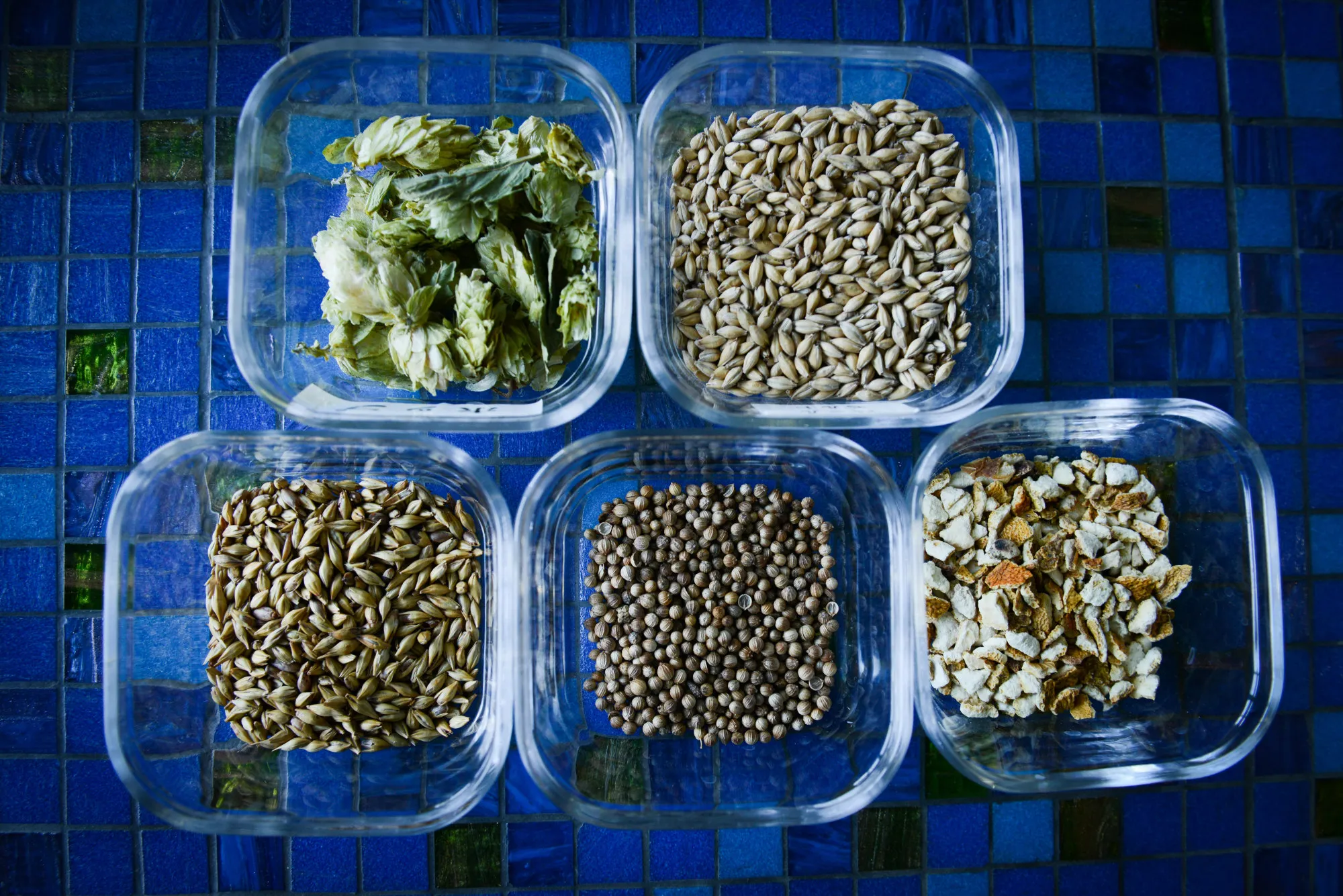展示的啤酒花、淡麦芽、焦糖麦芽、香菜和橙皮的罐子。
