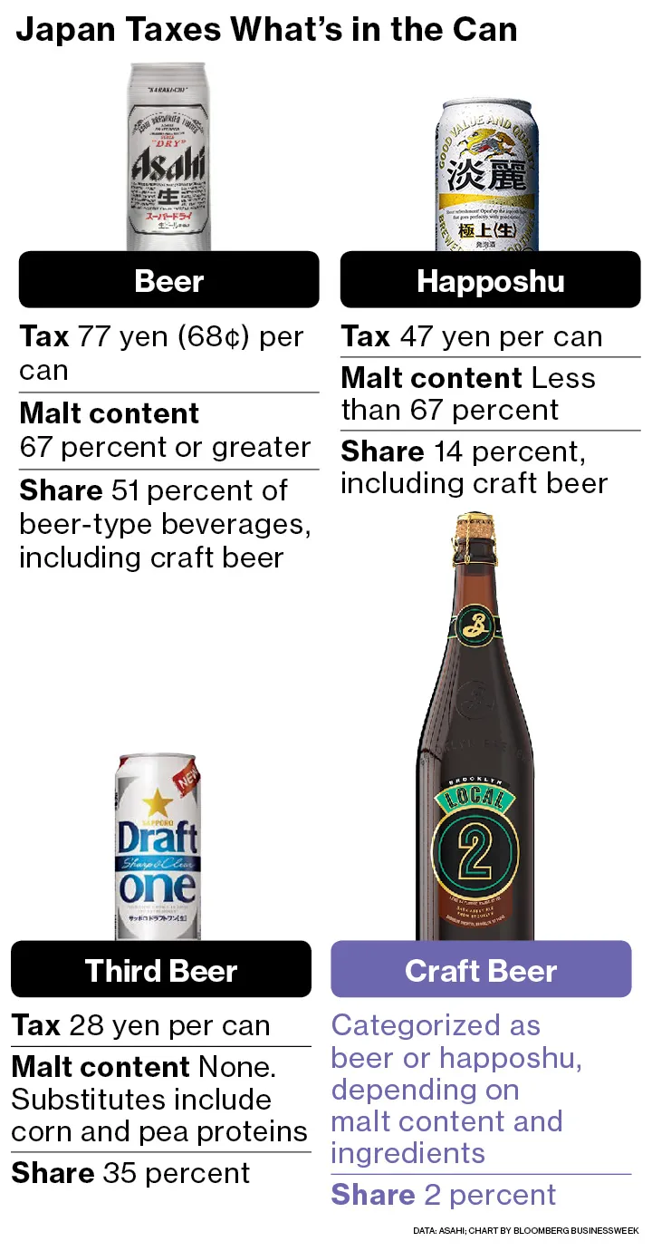 日本的五大酿酒商——朝日、麒麟、三得利控股、札幌控股和奥利安酿酒厂——长期以来一直认为税收过高,使得啤酒对普通饮用者来说过于昂贵。根据2016年一份代表酿酒商的游说团体的报告,一罐啤酒的税收为77日元(68美分),是美国的9倍,德国的19倍。如果麦芽含量降低到足够的程度,税收可能降至28日元。“我们过于关注通过价格战赢得市场份额,而忽视了最重要的——顾客,”麒麟的首席执行官磯崎义则说。
