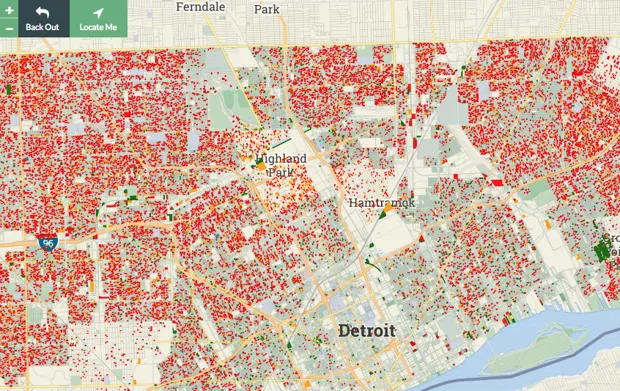 尽管埃斯特斯当时并不知道,她想象的数据库已经可用。自2011年以来,一家名为Loveland Technologies的营利性公民科技公司以地图形式发布公共财产数据,最初是关于县税收止赎拍卖中可用的地块和房屋。该公司的使命部分是帮助底特律人“对抗止赎的瘟疫”,通过“赋予”他们信息。联合创始人兼首席执行官杰瑞·帕芬多夫表示,他公司的指导原则是“让公共信息免费提供给公众。”