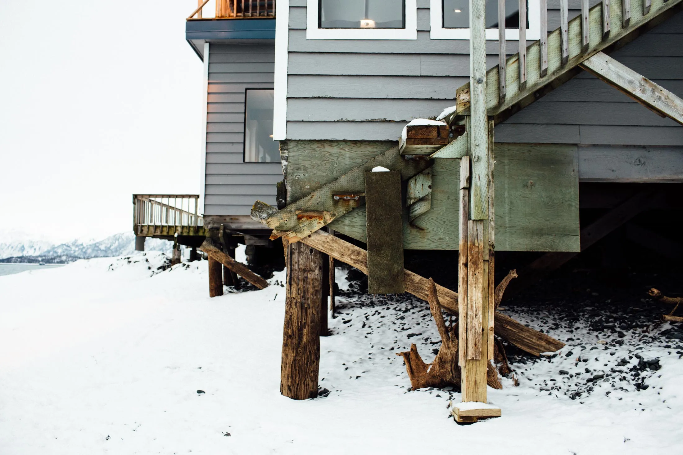 曾经通往甲板的楼梯在位于霍默尖端的土地尽头度假村因侵蚀而被毁坏。