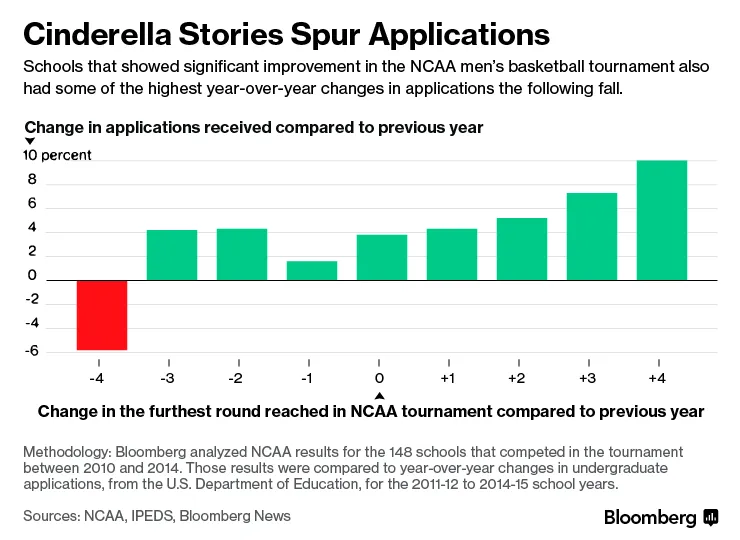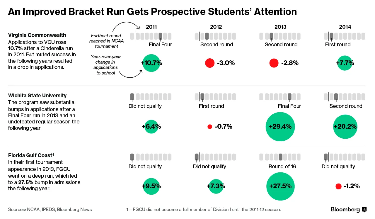 即使一所学校没有击败排名更高的竞争对手,如果他们在锦标赛中表现超出预期,仍然可能获得申请者的青睐。威奇托州立大学在2013年以第9种子身份进入四强后,申请数量增加了29%。前一年,他们未能进入第一轮。其他在锦标赛中比前一年多晋级四轮的学校,申请者中位数增加了10%。
