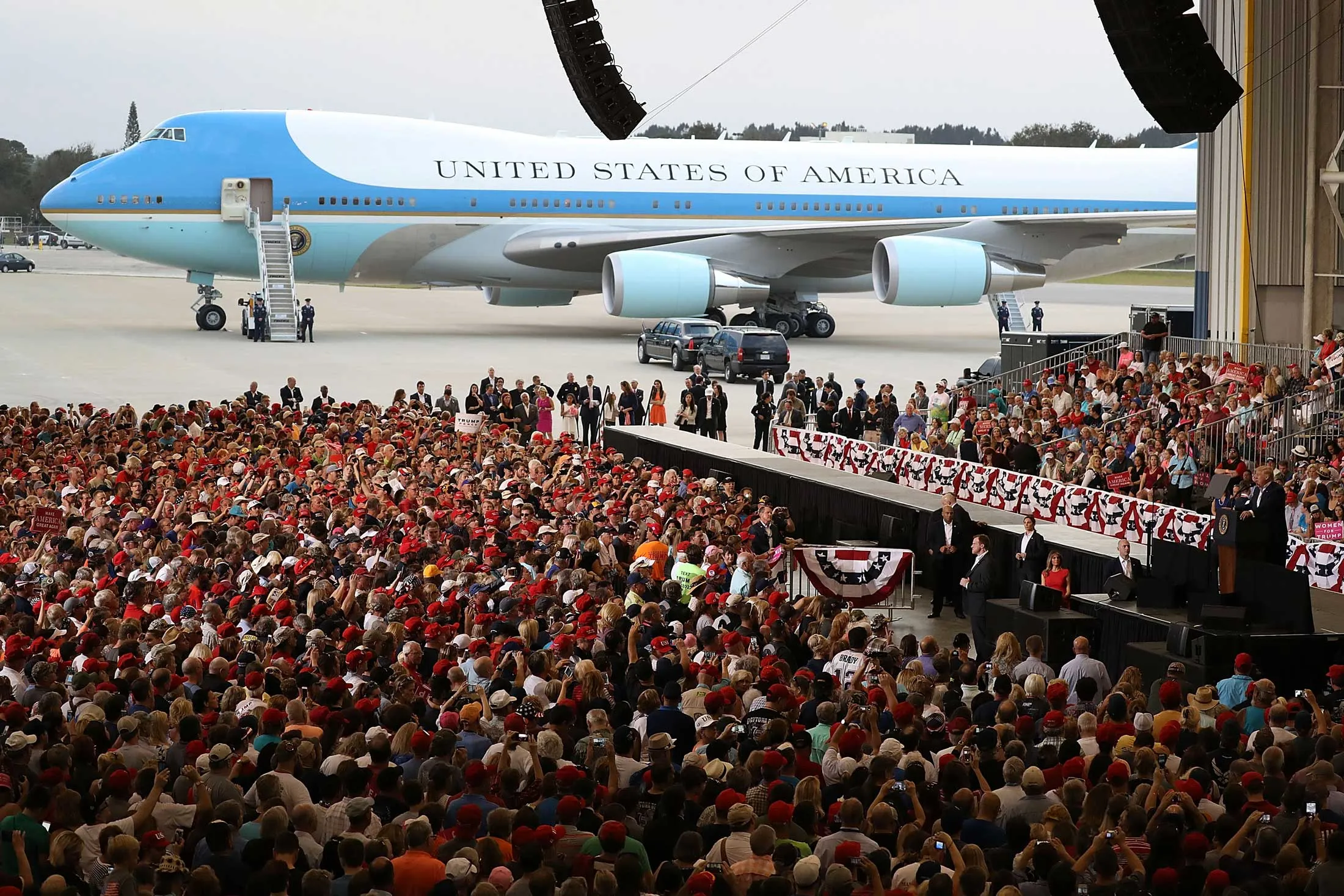 人们在2017年2月18日佛罗里达州奥兰多梅尔本国际机场的一个机库内听特朗普总统在集会上发言。