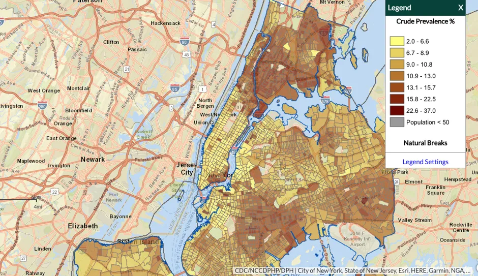 纽约市诊断糖尿病的估计发病率地图。布朗克斯是城市最北端的区,在多个指标上是最不健康的。CDC/500城市项目自2010年以来,罗伯特·伍德·约翰逊基金会将布朗克斯列为纽约州县健康排名的最后一位。18-64岁女性的糖尿病死亡率估计是曼哈顿非常白人的上东区的20倍,后者距离地铁仅十分钟。布朗克斯近三分之一的成年人肥胖,而纽约市的比例为四分之一;儿童肥胖率也很高。2012年,布朗克斯出现了超过3,000例可预防的心血管疾病住院病例,如高血压和充血性心力衰竭——这占纽约州所有此类入院的20%以上。根据纽约医学科学院的研究,缺乏健康食品选择、高贫困率、药物滥用和不稳定的住房是一些主要的风险因素。