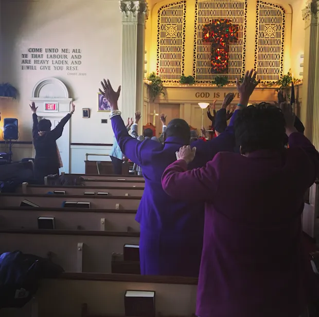 他们并不是在祈祷:这些来自西布朗克斯的教徒——大多数是年长的黑人女性,许多人穿着鲜艳的羊毛外套和毛皮边帽——正在进行锻炼休息。十分钟内,教徒们扭动上半身(每人12次),原地行走。不久,粉彩色的窗户因他们的努力而微微起雾。“精神健康可能是我们的优先事项,但我们也被上帝赋予了良好管理自己身体的责任,”57岁的苏珊·门多萨说,她在过去一年中一直负责这些休息活动。