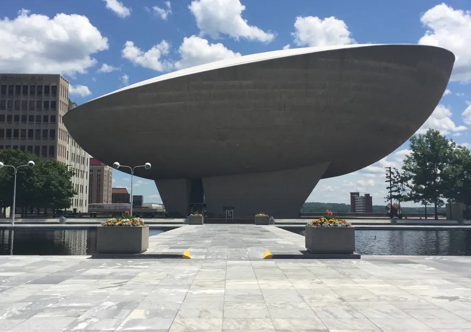 由州长尼尔森·洛克菲勒在餐巾纸上草拟,并由建筑师华莱士·哈里森忠实执行的这个大型项目——包括一个广阔的公共广场、四座相同的办公大楼、一座额外高的塔楼、一座立法办公大楼、一座司法大楼、一座州博物馆,以及一个被称为“蛋”的表演艺术中心——是你在美国找到的最接近巴西利亚的地方。