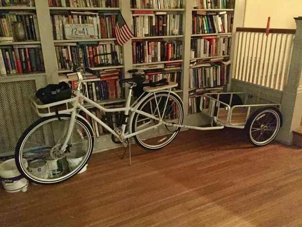 在周末,我以最宜家的方式测试了 Sladda 拖车:我在 Craigslist 上买了一台二手 RAST 五斗柜,并把它拖回家。自行车将小型三抽屉高柜从华盛顿特区肖区的一个安静小巷拖到我位于伍德利公园、靠近国家动物园的家。拖车的承重为 100 磅,所以 27 磅的松木箱子毫无问题;在家具侧放并用弹力绳固定后,我在佛罗里达大道的车道上穿梭,绕过亚当斯摩根的施工现场,跨过杜克·艾灵顿大桥,将这件家具送到我所在的地方,毫发无损。此次更新过程中没有汽车或城市实验室的作者受到伤害。