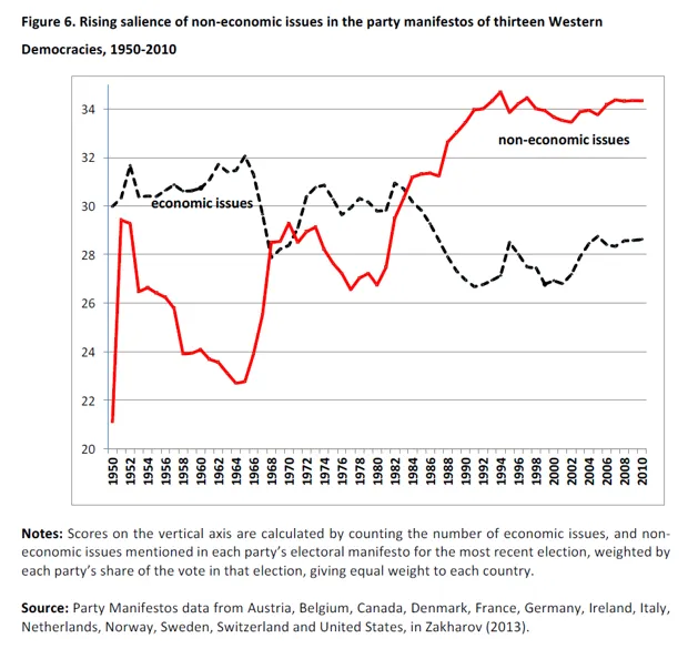 经济问题和利益已被文化仇恨和冲突所取代**。**此外,经济问题对选民的重要性已经下降,而文化问题——围绕女性权利、堕胎、同性婚姻和同性恋权利——则已上升到前台。更不用说,阶级投票总体上自1950年代和1960年代以来已经下降,那时工人阶级是政治左翼的坚实支持者。到1980年代和1990年代,阶级投票在大多数欧洲国家降至历史最低水平。