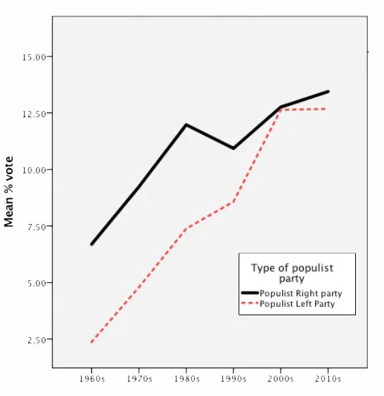彭博社城市实验室美国人如何投票导致住房危机加州大学伯克利分校为转学学生提供专门建造的校园住所熊队首席警告芝加哥缺乏新NFL体育场的风险罗马可能开始对特雷维喷泉收取入场费在欧洲,自1960年代以来,投给民粹主义政党的选票份额已从5.1%翻倍至2012年的13.2%;在同一时期,民粹主义政党所占的席位份额从3.8%增加到12.8%。下图显示了民粹主义政党在左右两翼的选票份额稳步上升。