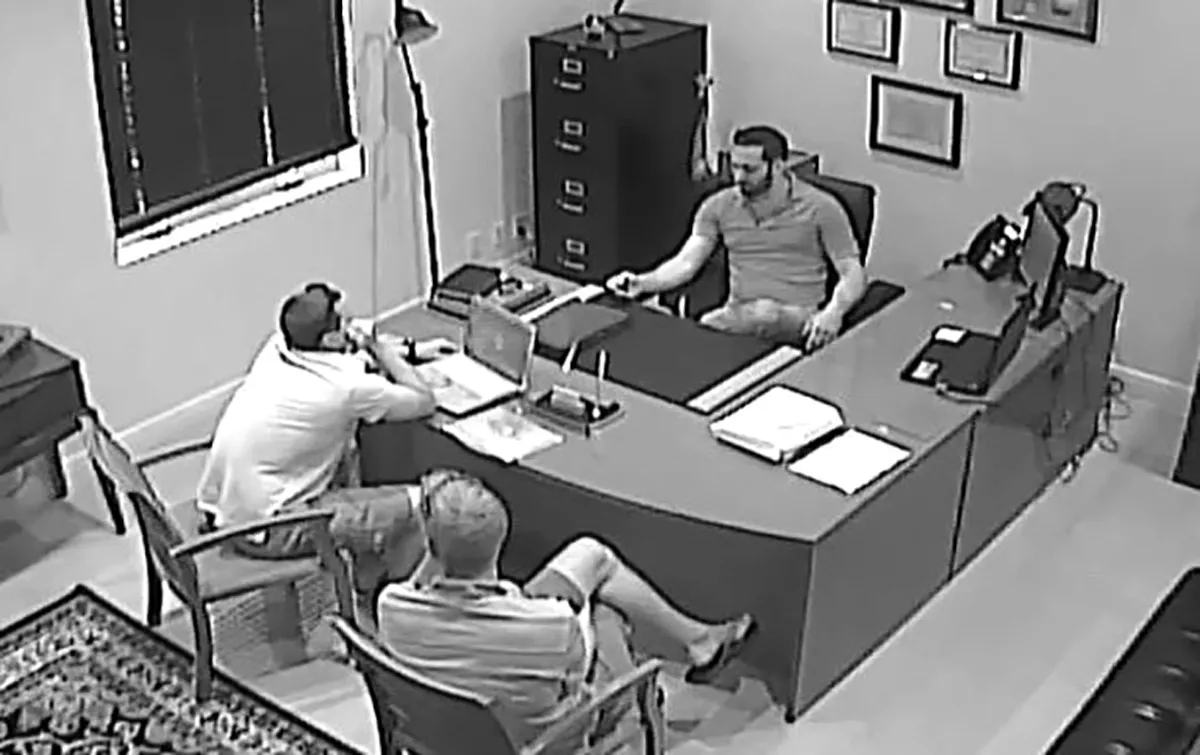 这是监控录像中的一帧,显示了Gentile(上)、Bradley(下)和另一名FBI特工在巴哈马就Milrud调查进行商谈。特工们讨论了Gentile可能被内部调查员问到的问题,告诉他不要说太多。他们建议他说他没有指挥任何犯罪活动。(“当然我有,”Gentile说。)他们还说不要提到他的枪。