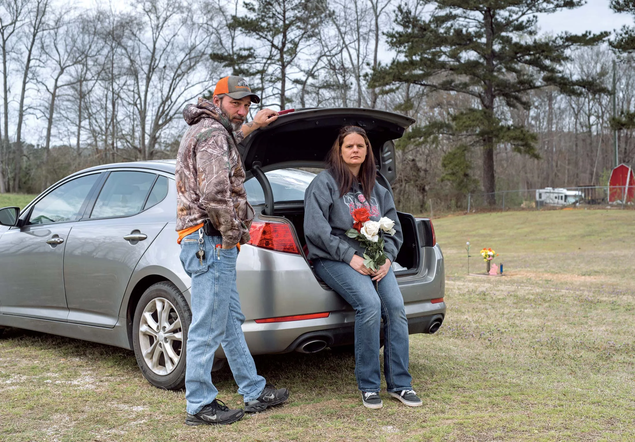 安吉尔·奥格尔和她的丈夫罗比·奥格尔在安吉尔女儿瑞吉娜·埃尔西的墓前。