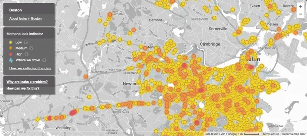 这支汽车队是简化这一过程的一种方式。配备传感器的汽车在波士顿、伯灵顿、芝加哥、达拉斯、印第安纳波利斯、杰克逊维尔、洛杉矶以及纽约的斯塔滕岛和锡拉丘兹巡游。研究人员随后绘制了结果,展示了泄漏的聚集情况。