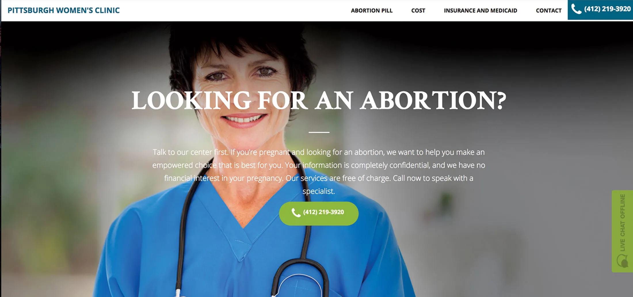 想象一下你怀孕了,而你并不想要。你在谷歌中输入“匹兹堡堕胎”,第一个结果是匹兹堡妇女诊所,提供“免费堕胎咨询”。“只有你知道什么对你最好,”谷歌广告上写道。“当天预约可用。立即拨打!”你点击后,看到一张微笑的女性医生和听诊器的照片。“在寻找堕胎吗?”她用65号字体问道。但你不会从她那里或匹兹堡妇女诊所得到堕胎。没有一个精确名称的诊所存在。