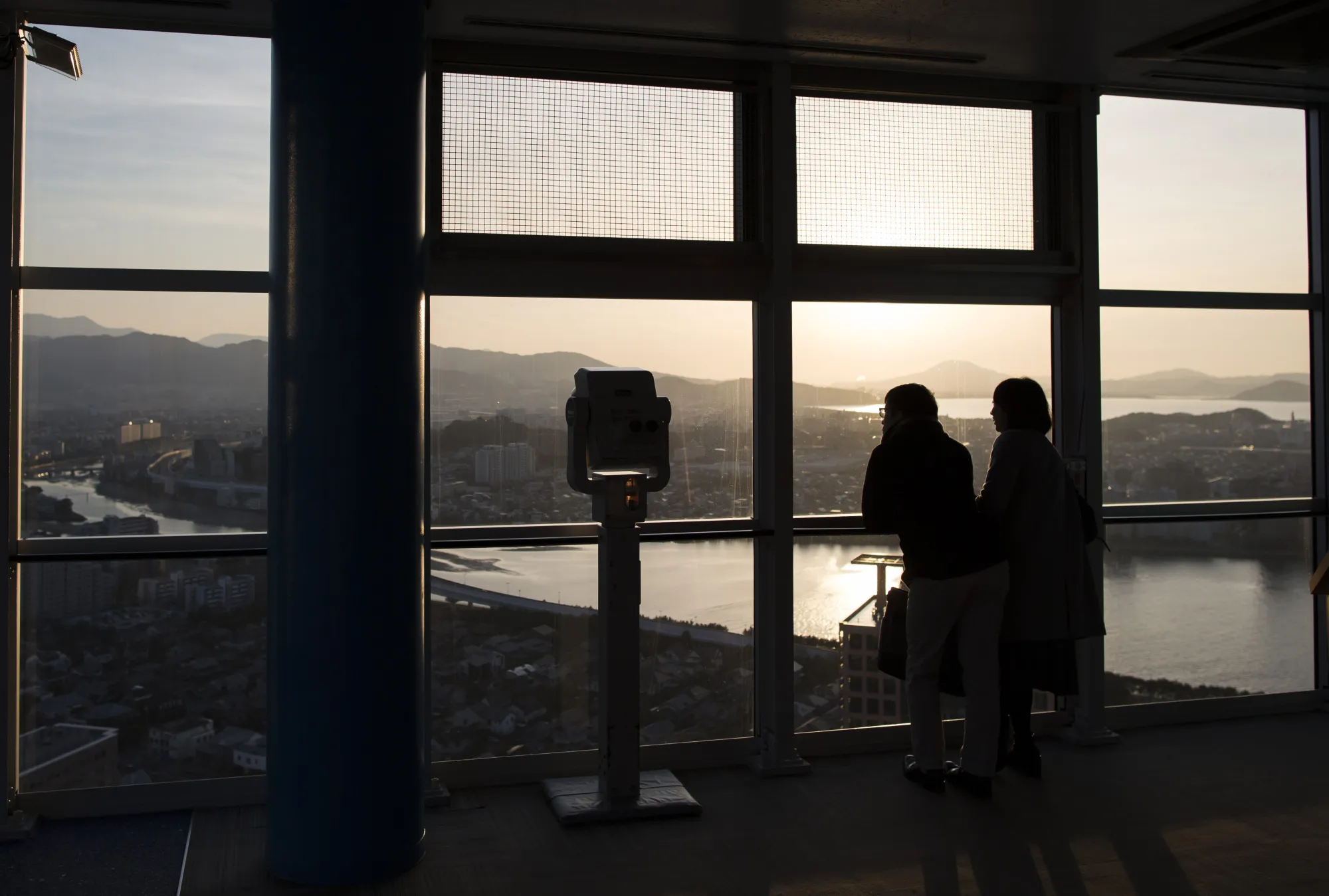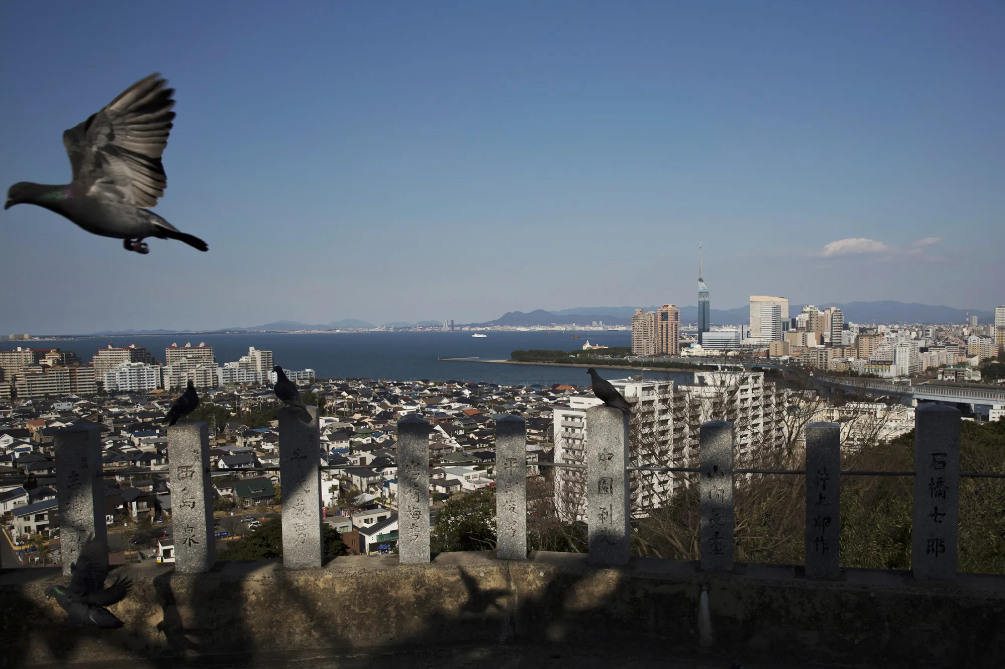 游客在福冈塔的观景台上眺望。摄影师:大住智宏/彭博社福冈被群山环绕,距离韩国釜山港200公里——乘坐“甲壳虫”喷气式水翼船需三小时——其发展既受地理因素影响,也得益于规划。
