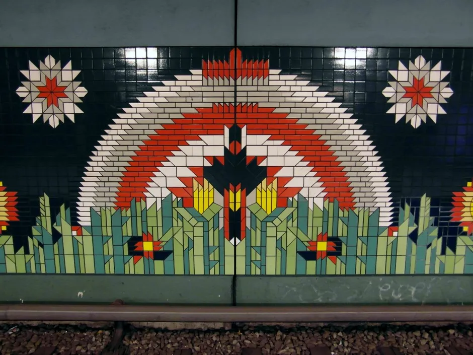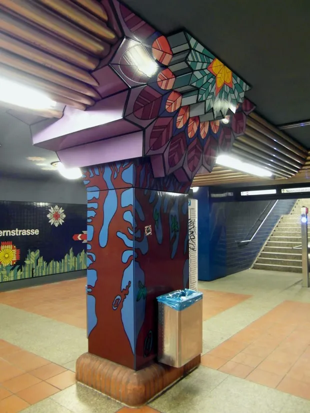 齐塔德尔地铁站。A.Savin/维基媒体然而,当没有明显的地方参考来指导车站的风格时,鲁姆勒真正发挥了创意。例如,保尔施特恩街站就位于一个没有明显地标的无人区。由于缺乏地方来源,鲁姆勒变得特别富有创意。他的设计灵感来自于想象200年前在柏林和斯潘道之间的马车旅行中可能看到的树木、花朵和星星,当时某个保尔·施特恩的客栈正在接待旅客。结果既迷人又奇特,甚至有些超现实。
