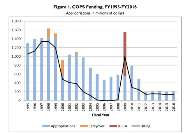关于COPS资金是否真的必要,这是一个合理的问题。警察组织表示,这笔资金在1990年代帮助降低犯罪率方面发挥了重要作用,但这一结论并不被普遍认可。国会研究服务处实际上研究了这个问题并发现“研究表明COPS拨款对犯罪率产生了负面影响”,尤其是在超过250,000人口的城市中。