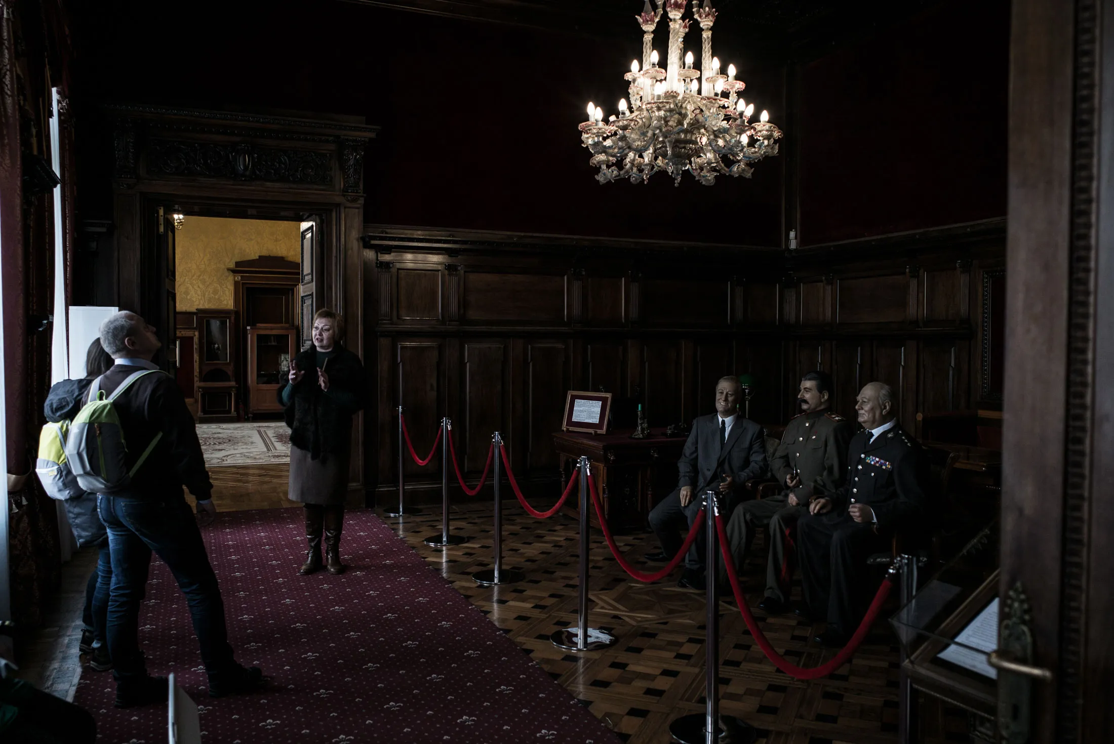 一位导游展示了新获得的富兰克林·德拉诺·罗斯福、约瑟夫·斯大林和温斯顿·丘吉尔的蜡像,地点是1945年雅尔塔会议的现场。摄影师:米沙·弗里德曼,彭博社在文化上,克里米亚也在变化。没有什么比参观一个曾经的绝密核潜艇基地,现在变成冷战博物馆,更能清楚地体现这一点。与一群俄罗斯人沿着防爆走廊行走时,导游描述了美国这个乌克兰盟友如何渴望与俄罗斯开战,以及制裁只是第一轮攻击。