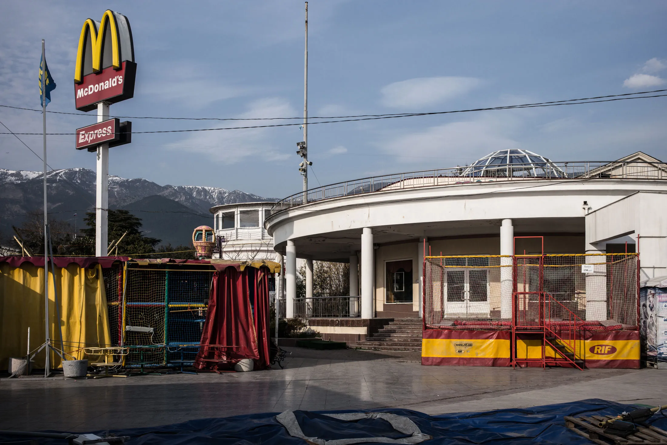 位于雅尔塔市中心的一家关闭的麦当劳。摄影师:米沙·弗里德曼,彭博社大型跨国公司在该半岛上并未开展业务,因此麦当劳公司、瑞迪森酒店和移动电信系统PJSC(MTC)都已关闭。不过,类似于巨无霸的汉堡在 AvtoFood 快餐连锁店中被称为“巨型食品”,还有其他类似于麦当劳菜单上的选择,包括“鱼柳汉堡”。一家瑞迪森酒店现在被称为“里维埃拉日出”,其标识使用相同的字体。尽管信用卡公司已正式停止在此地开展业务,但克里米亚人仍然可以使用由俄罗斯银行发行的Visa或MasterCard。