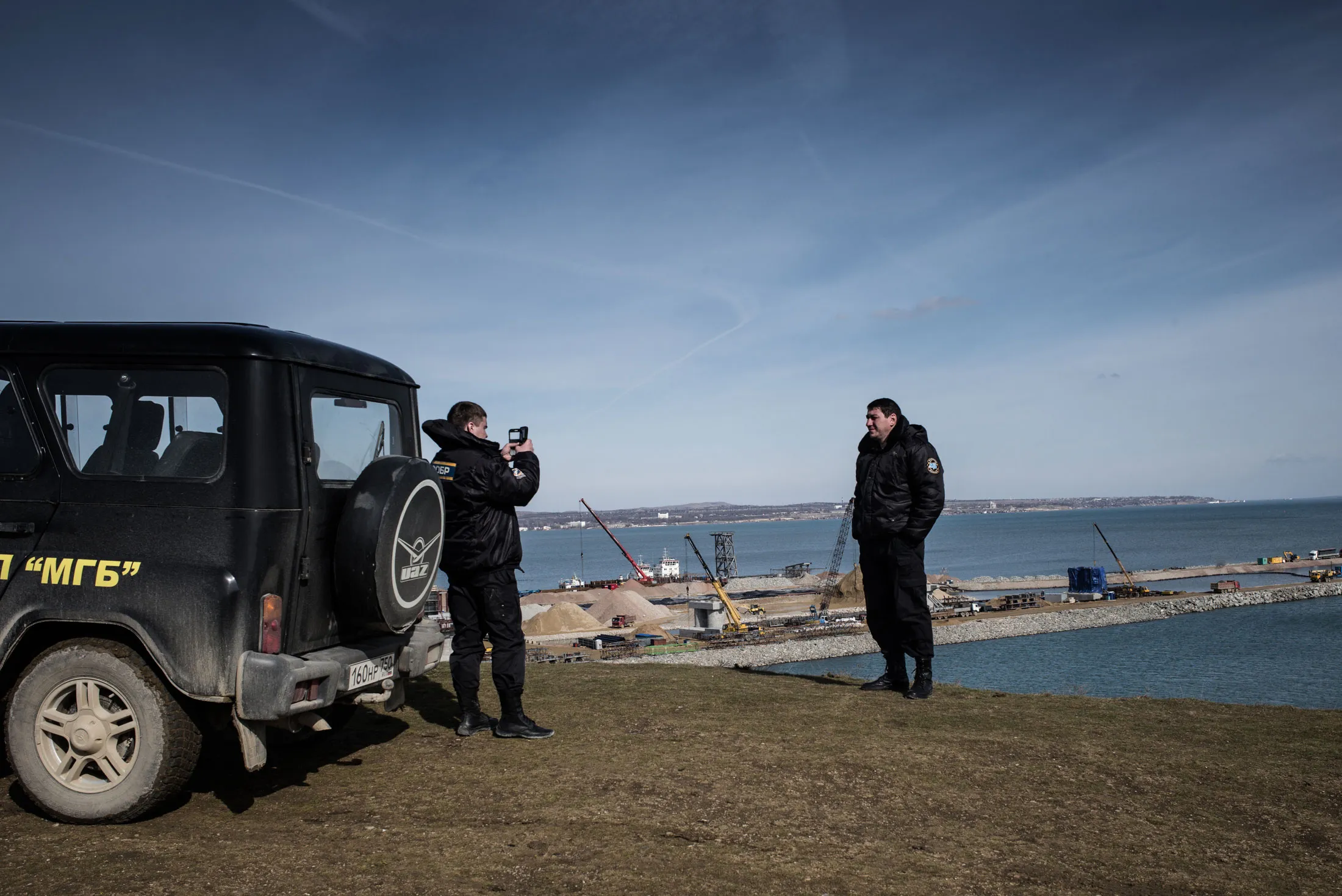 私人保安在未来连接克里米亚与俄罗斯克拉斯诺达尔地区的桥前摆姿势拍照。摄影师:米莎·弗里德曼,彭博社
