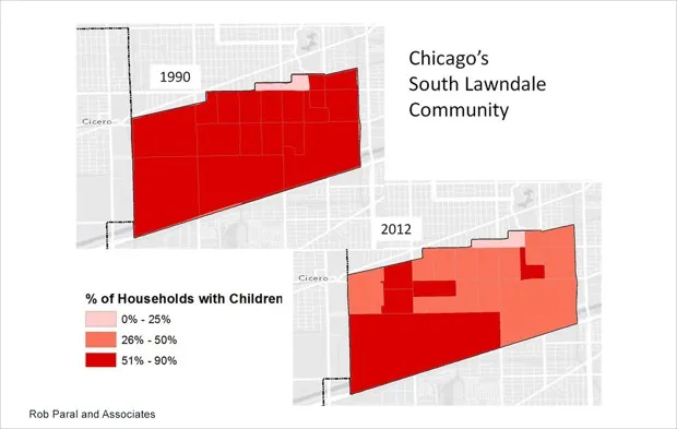 在芝加哥,曾经充满活力的西班牙裔聚居区开始衰退。例如,南劳恩代尔在2000年至2010年间失去了10%的居民。人们在去世或搬走,而没有得到替代。为了展示该地区的老龄化情况,下面是Paral及其同事创建的地图,比较了1990年和2012年南劳恩代尔有孩子的家庭比例: