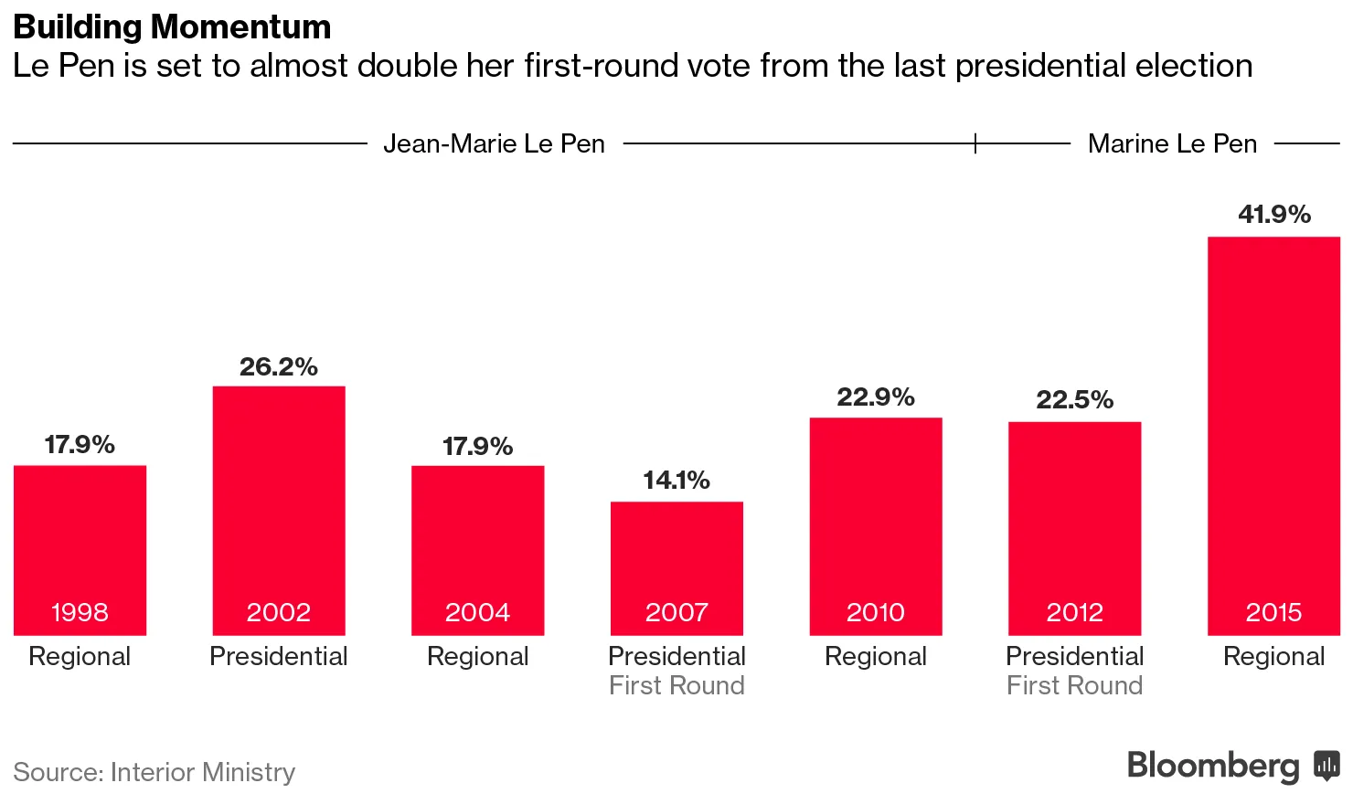 在法国政治中作为边缘力量的这些年里,该党在所谓的“黑脚”——1962年独立后离开阿尔及利亚的法国人中享有支持,而该地区的经济问题扩大了勒庞激进计划的吸引力。