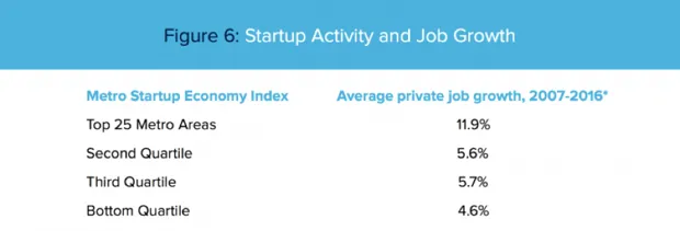 迈克尔·曼德尔/TechNet根据这个指数,曼德尔发现,在前25个创业中心中,工作增长最为强劲,从2007年到2016年平均增长11.9%,而其他前100个创业中心的增长大约只有一半。即使考虑到国家领先创业中心的“卓越经济表现”,他也发现他的创业指数与工作增长之间存在正相关关系。即使在排除前十个中心的分析时,这一关系依然成立。