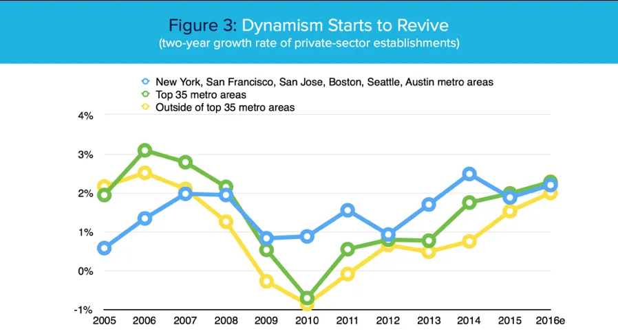 迈克尔·曼德尔/科技网上面的图表显示了曼德尔所定义的活力在大萧条后的回升。它绘制了旧金山、圣荷西、纽约、西雅图、波士顿和奥斯汀等主要科技中心的私营部门商业机构的两年增长情况,以及前35个大都市和全国其他地区。在这三种情况下,随着大萧条的到来,线条向下,但近年来又转向上升。正如曼德尔所指出的:
