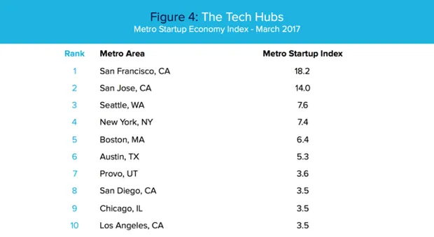 曼德尔的城市创业指数基于包含“创业”一词的职位发布的百分比,并根据所有城市的中位百分比进行标准化。下表显示了美国在这一指标上的前十个科技中心。