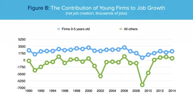 迈克尔·曼德尔/科技网首先,他发现,在过去25年中,年轻公司——即成立五年或更短时间的公司——在创造就业方面的表现显著优于老公司,基于美国劳工统计局的数据。在2014年,最新的可用数据中,年轻公司创造了220万个就业岗位,而成立超过五年的公司仅创造了45万个岗位。