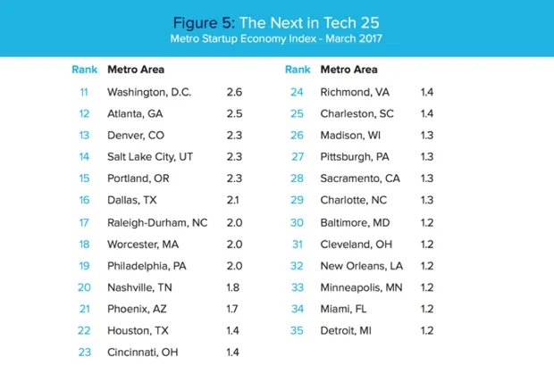 迈克尔·曼德尔/科技网毫无疑问,旧金山和圣荷西(硅谷)位居榜首。实际上,旧金山在曼德尔的创业指数中超过了硅谷,反映了我自己的发现。西雅图和纽约紧随其后,然后是波士顿和奥斯丁,普罗沃、圣地亚哥、芝加哥和洛杉矶则位列前十。曼德尔的创业指数中接下来的25个主要城市则更加有趣(见下表)。它们包括一些知名的知识和科技中心,如华盛顿特区、亚特兰大、丹佛、盐湖城、波特兰、达拉斯和北卡罗来纳州的罗利研究三角区。但也有像底特律、匹兹堡、克利夫兰和辛辛那提这样的“铁锈带”城市。像凤凰城、查尔斯顿、迈阿密和新奥尔良这样的南方和阳光带城市也出现在其中。