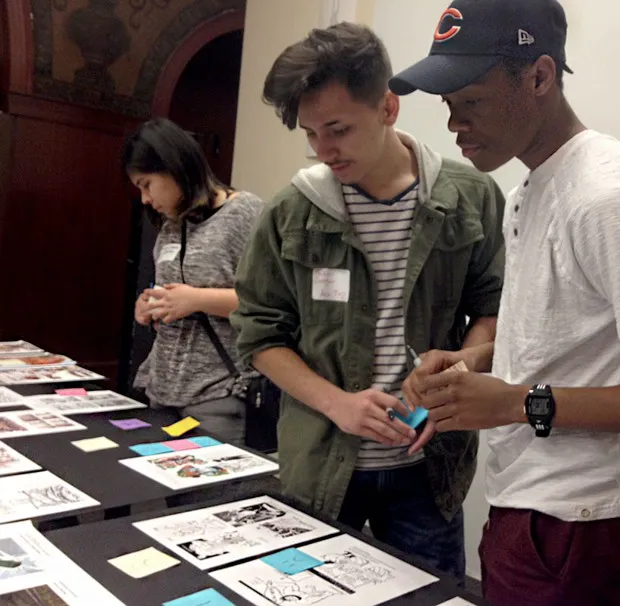芝加哥建筑基金会的青少年学员对图画小说《没有小计划》的插图提供反馈。图片由芝加哥建筑基金会提供莱昂在与猫之眼艺术家集体共同开发小说的情节和插图时,寻求了青少年学员的建议,这个团体由艺术家德文·莫德斯利创立,成员包括来自芝加哥艺术高中教师和一名毕业生:凯斯·贝耶、克里斯·林和德昂·里德。最终结果是一本精美绘制的三部分作品,讲述了1928年、2017年和2211年芝加哥青少年的故事。