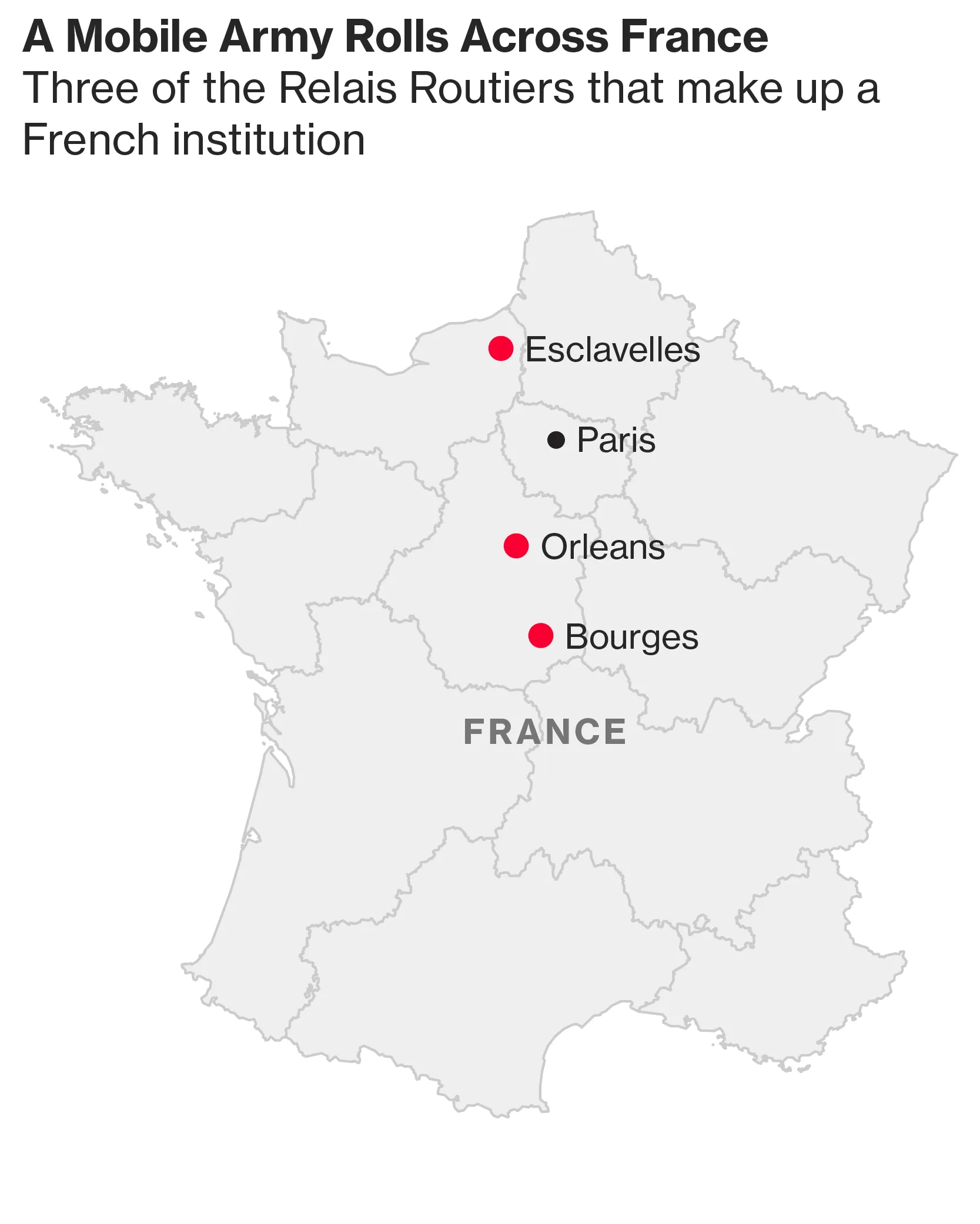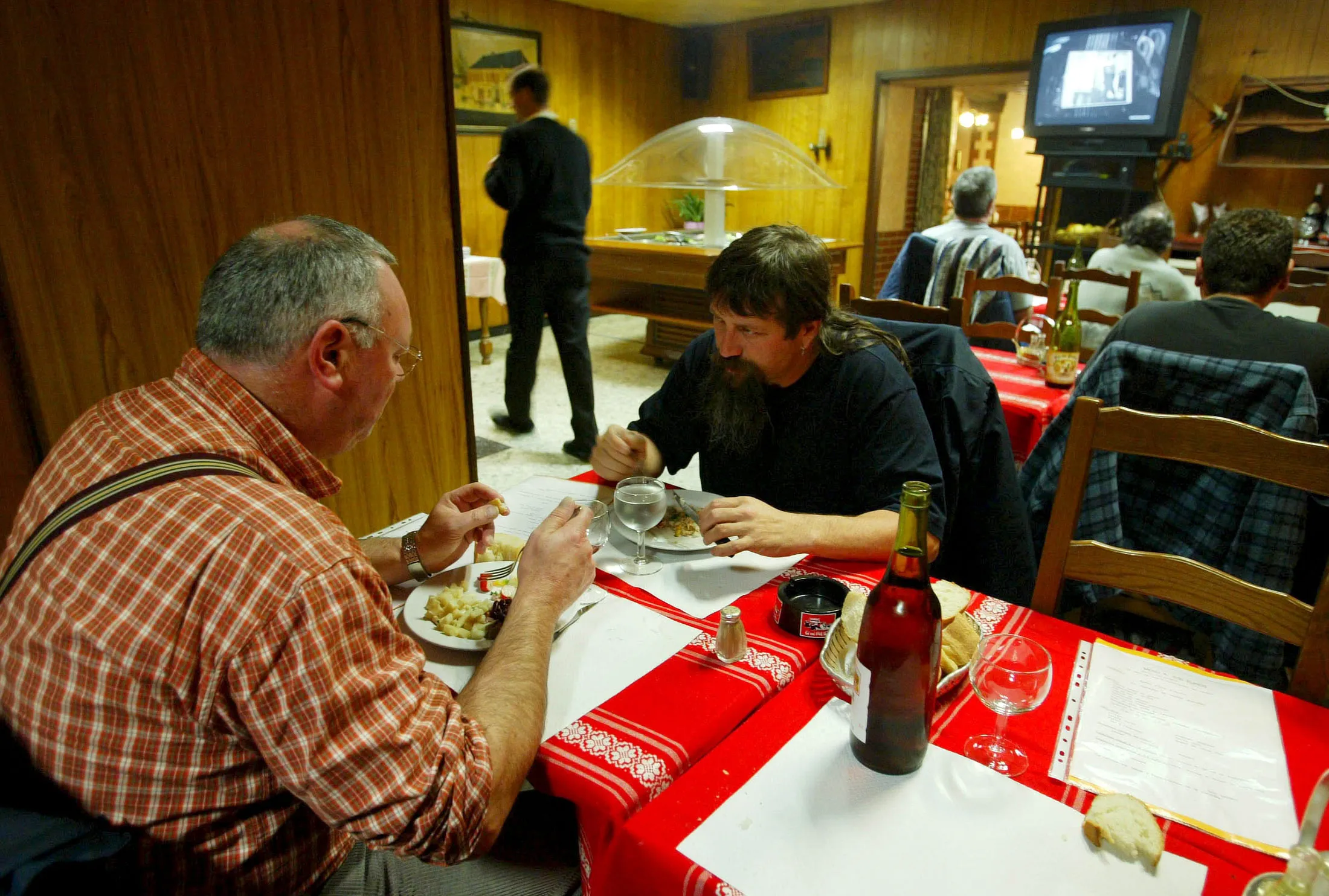 在法国北部的Relais des Hayons,180名卡车司机正在享用小牛头、血肠和其他美味的四道菜套餐,配有葡萄酒,然后退回到停在外面的卡车队伍中。