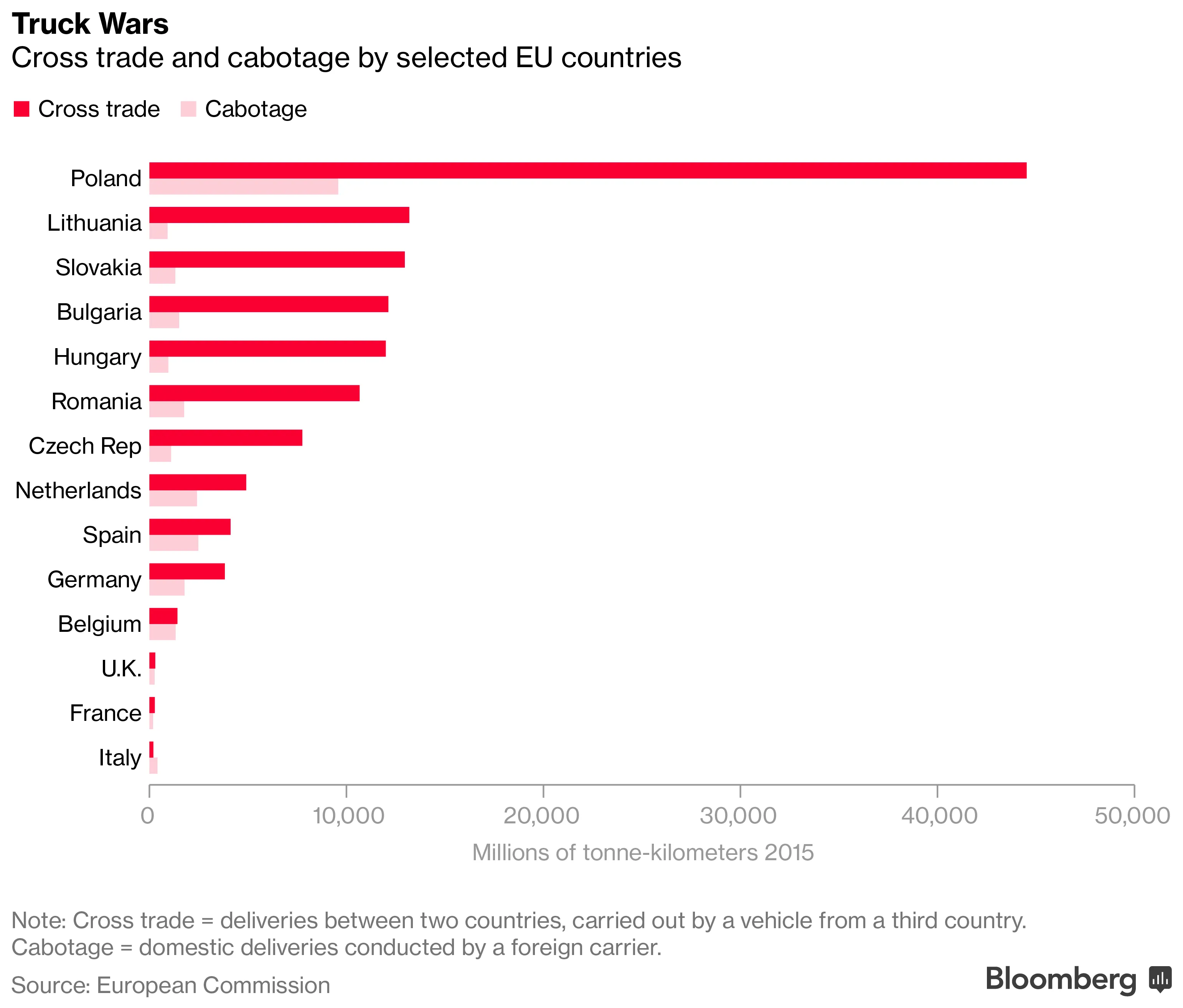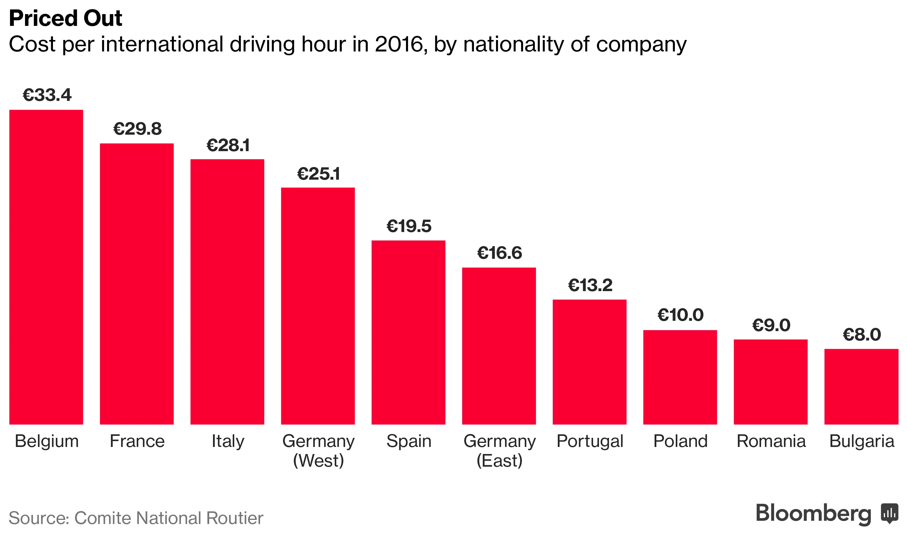 根据由法国国家资助的运输智库Comite National Routier的数据,雇主为司机支付的总成本从保加利亚的每年16,000欧元到比利时的56,000欧元不等。
