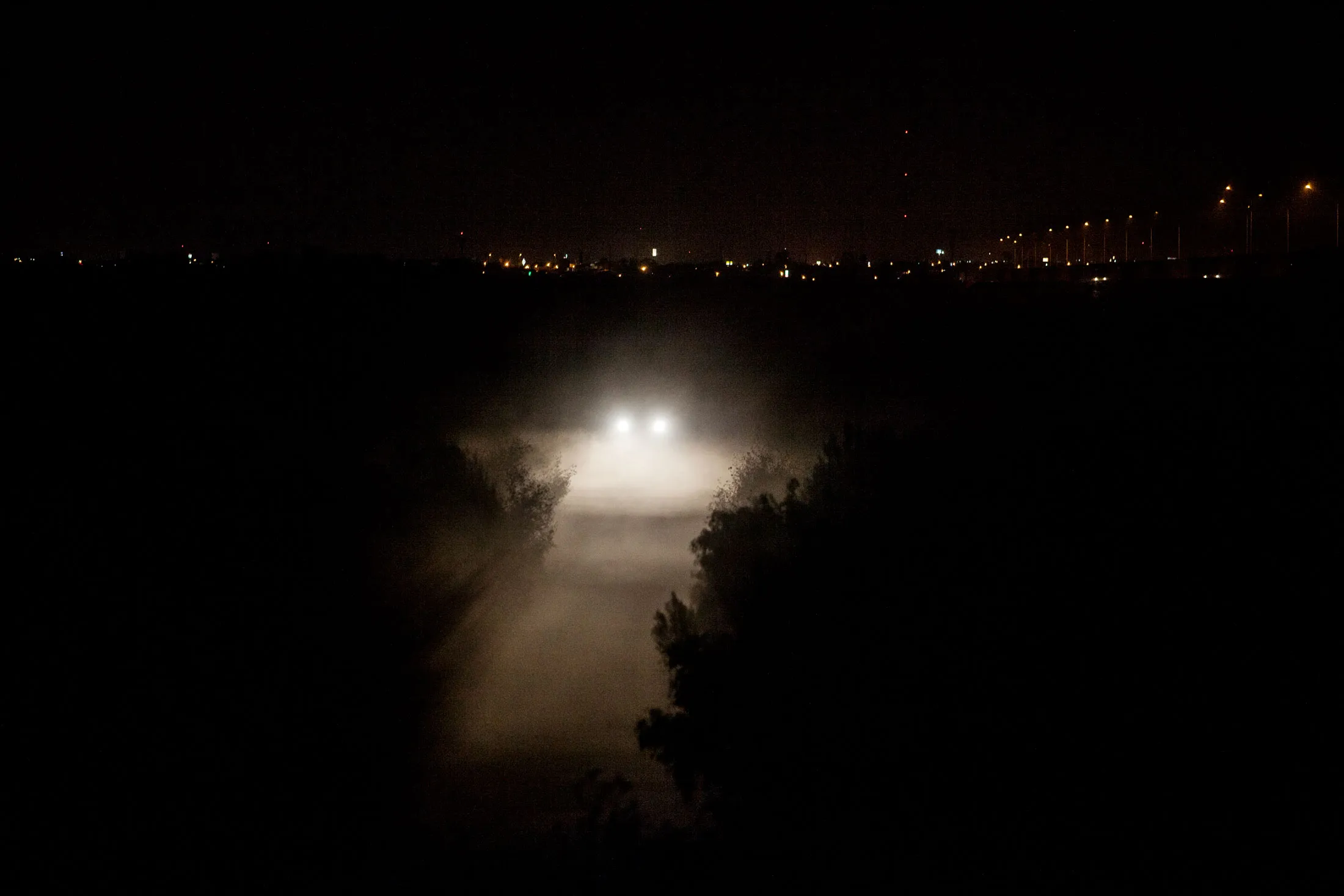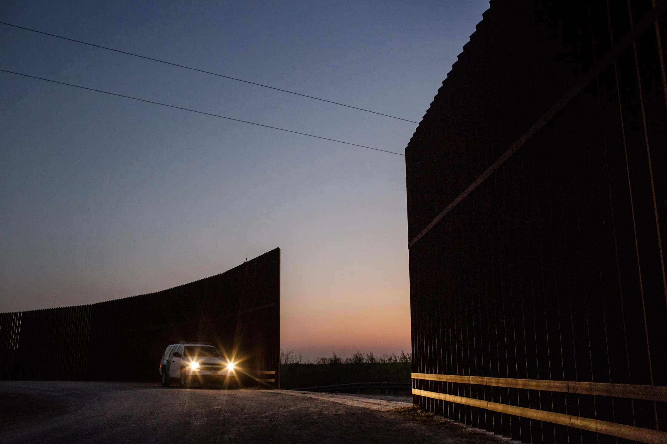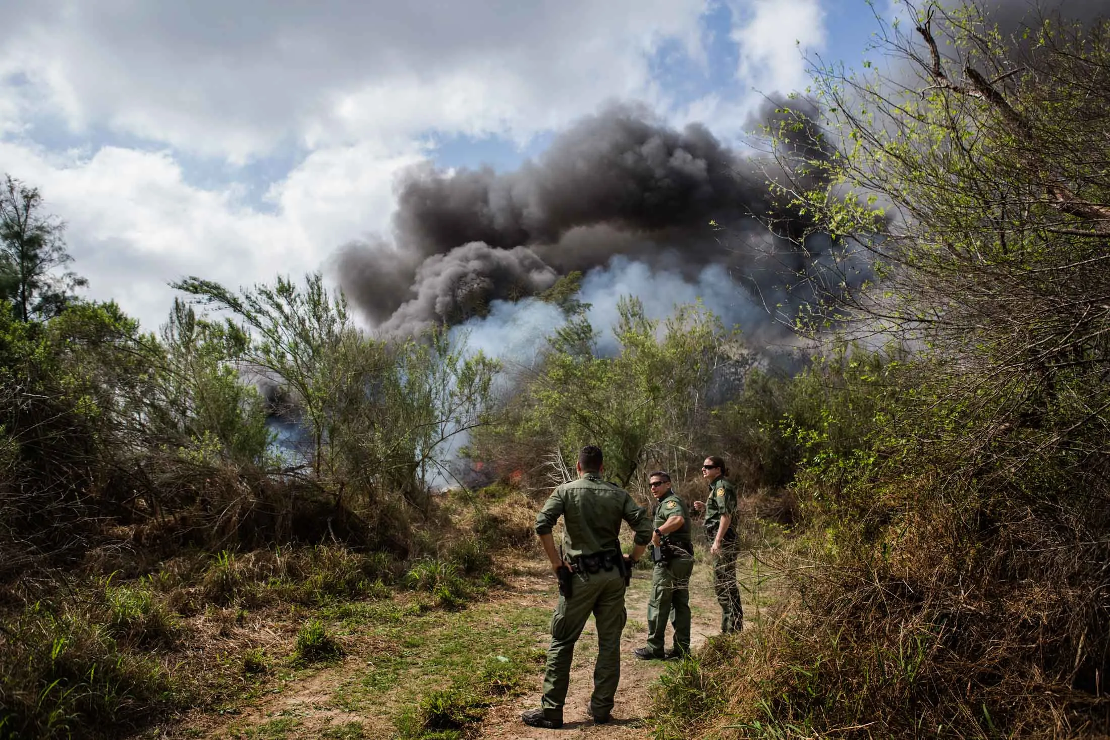 边境巡逻特工在墙南侧的一个田野中观察一辆汽车着火。特工们追踪了这辆他们认为装载了毒品的车辆。司机试图将车“溅入”里奥格兰德河,但车辆发生了碰撞,然后起火。司机逃跑并成功渡过河到达墨西哥。摄影师:Kirsten Luce 为《彭博商业周刊》拍摄