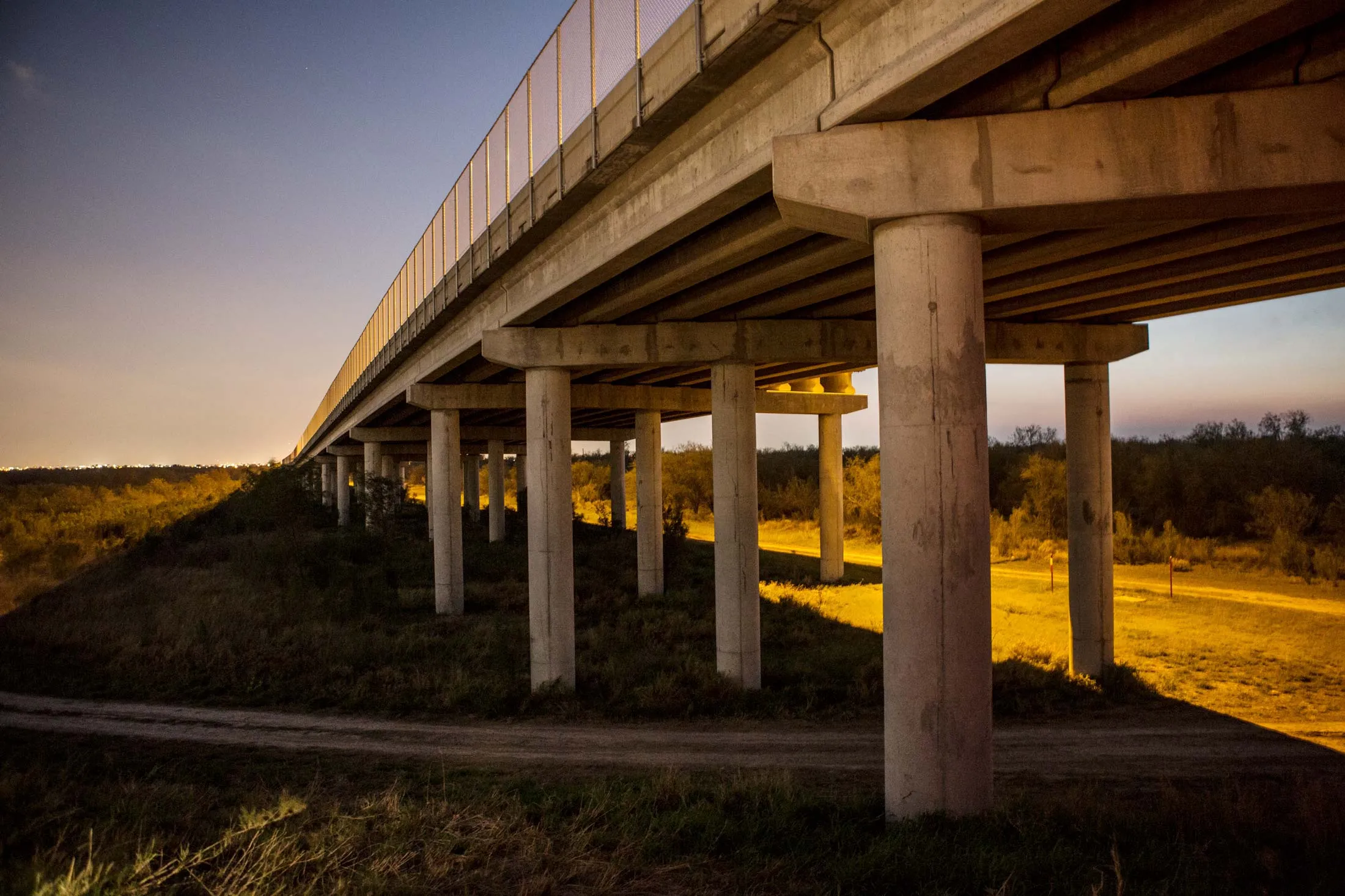 在安萨尔杜阿斯国际桥下,这是一个连接墨西哥雷诺萨和德克萨斯州繁忙边境城镇麦卡伦的官方入境口。该桥于2009年完工,足够高以容纳其下的墙体,墙体与桥同时建造,还有一个国家野生动物保护区。里奥格兰德河沿岸的洪泛区孕育了美国最具生物多样性的生态系统之一。该国剩余的美洲豹(估计有50只)全部生活在该地区。墙体可能导致栖息地破碎,威胁几种稀有动物和鸟类的生存。摄影师:Kirsten Luce 为《彭博商业周刊》拍摄