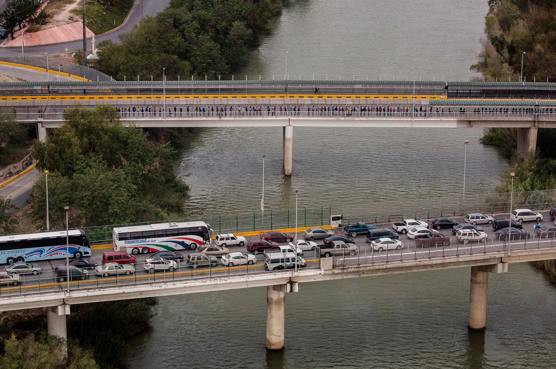在一个繁忙的工作早晨,进入美国的交通在连接墨西哥雷诺萨和德克萨斯州希达尔戈的桥上逐渐增加。南行的车辆和行人走另一座桥。去年,约有650万辆汽车、47万辆卡车、4万个装载的铁路集装箱和1.6万辆公交车通过了像这样的官方过境点进入美国南部边界。摄影师:Kirsten Luce 为《彭博商业周刊》拍摄