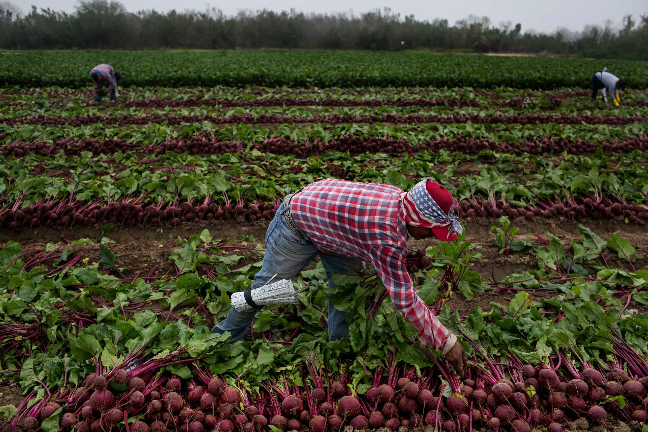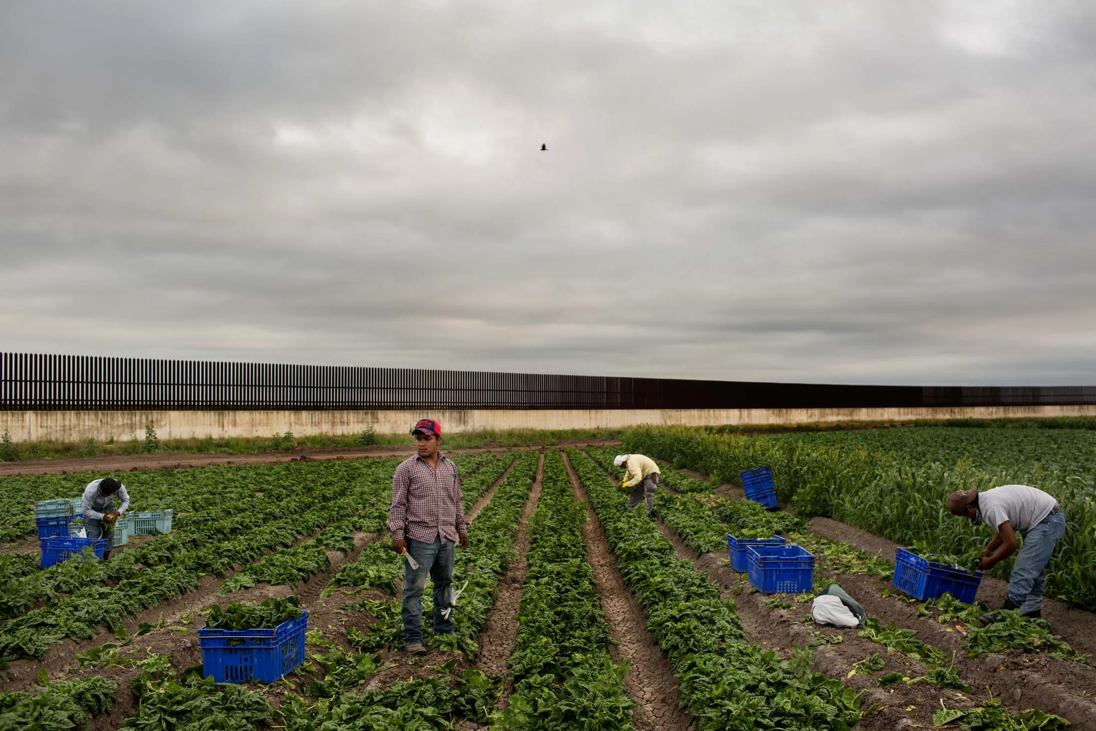 工人在唐娜的一处农场采摘甜菜,距离墙壁仅不到50英尺,南边就是里奥格兰德河。摄影师:Kirsten Luce 为《彭博商业周刊》拍摄